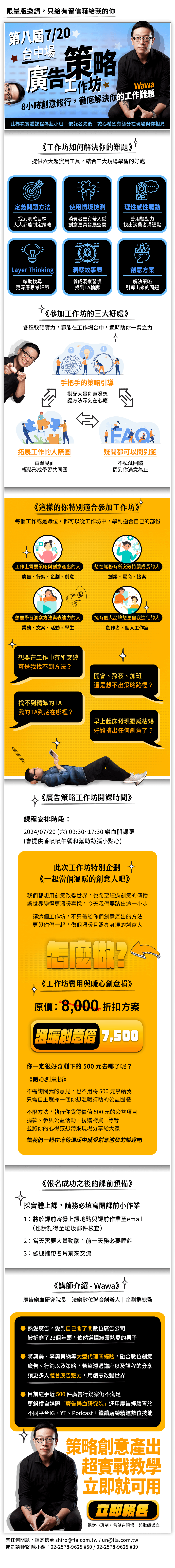 將奧美、李奧貝納等大型代理商經驗,融合數位創意、廣告、行銷以及策略,希望透過工作坊、講座、課程,讓更多人體會廣告魅力,用創意改變世界。