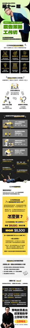 將奧美、李奧貝納等大型代理商經驗,融合數位創意、廣告、行銷以及策略,希望透過工作坊、講座、課程,讓更多人體會廣告魅力,用創意改變世界。